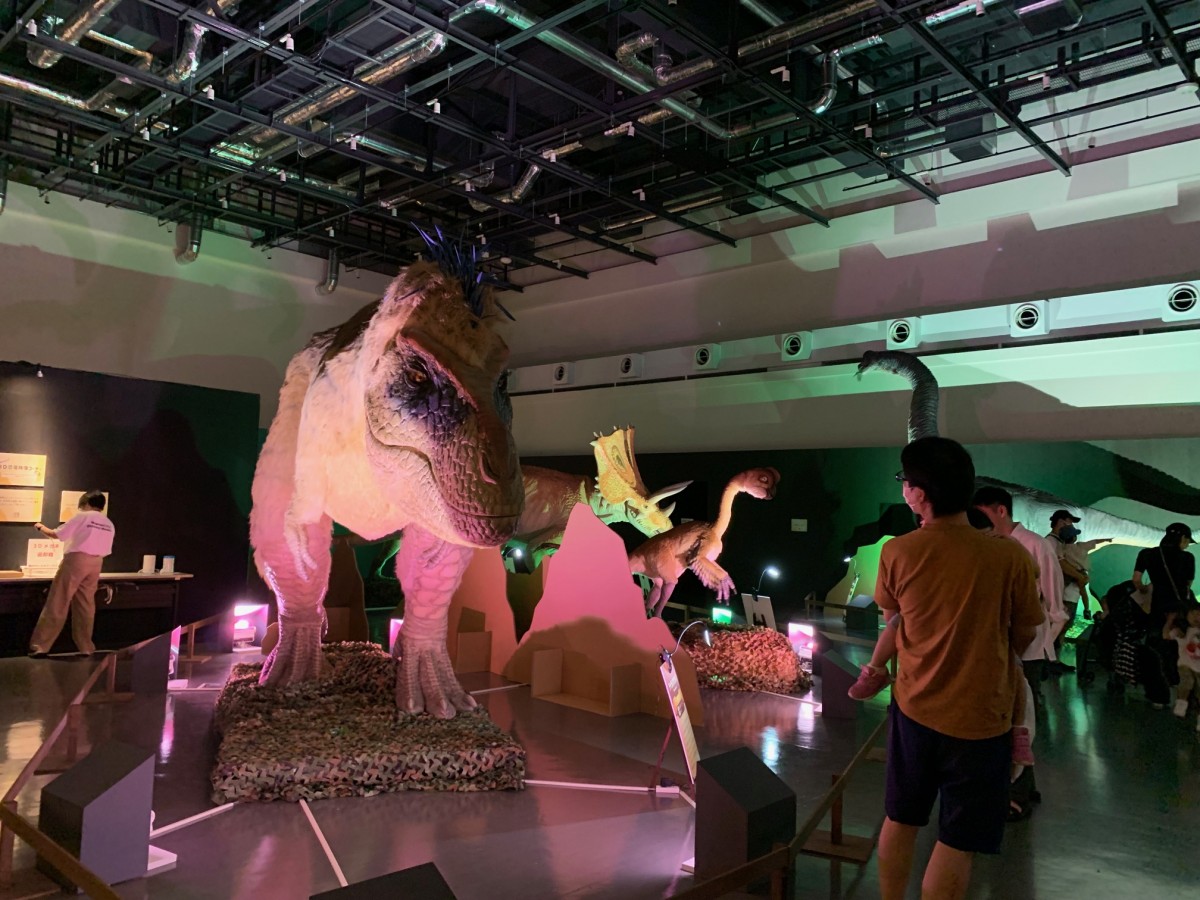 恐竜大型ロボットやフィギュア、3D立体恐竜映像などで肉食恐竜や植物食恐竜、雑食恐竜が闊歩した「よみがえる恐竜ワールド」を再現展示。
